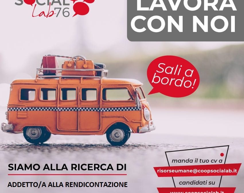 La Cooperativa Social Lab76 di Benevento seleziona una figura junior per la posizione di addetto/a alla rendicontazione che si occupi dei progetti realizzati dalla Cooperativa e finanziati dai principali fondi europei, ministeriali e regionali.